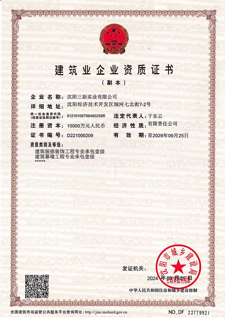 建筑裝修裝飾工程專業(yè)承包壹級(jí)、建筑幕墻工程專業(yè)承包壹級(jí)