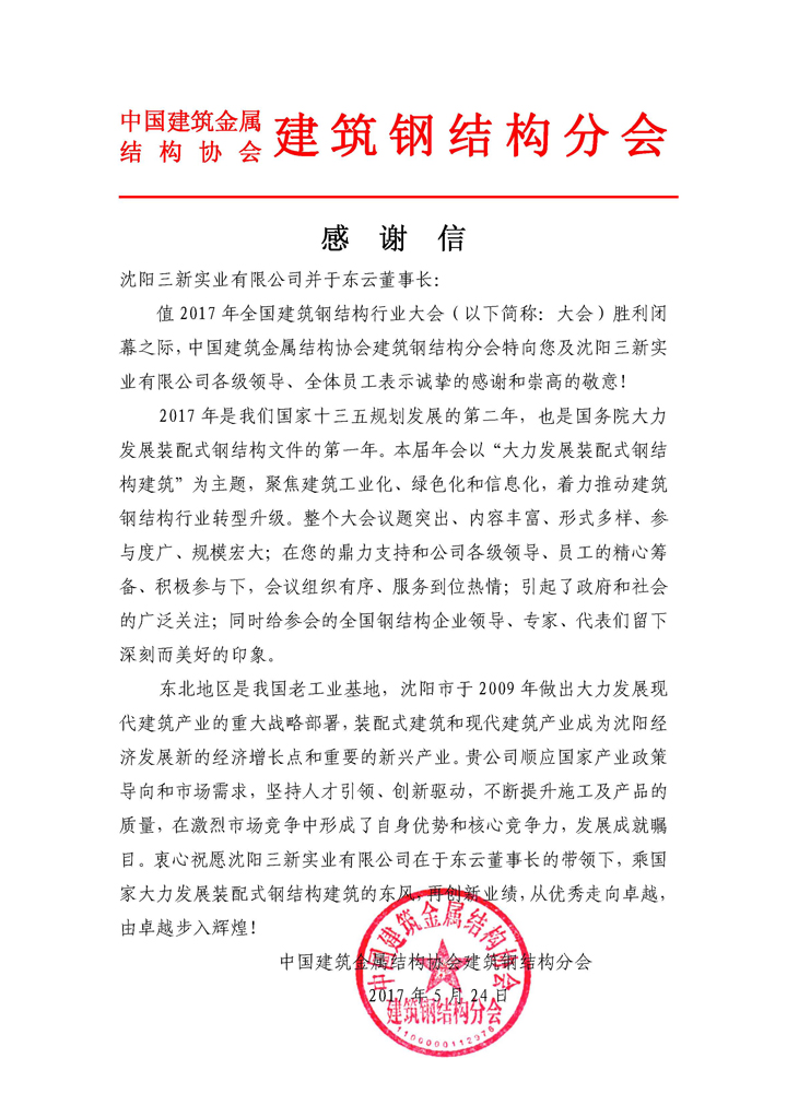 2017年全國建筑鋼結(jié)構(gòu)行業(yè)大會(huì)勝利閉幕了,這是一個(gè)圓滿的大會(huì)和勝利的大會(huì)。作為承辦方,三新集團(tuán)從會(huì)議的籌備到大會(huì)的服務(wù)全過程交出了完美的答卷,這是三新集團(tuán)綜合實(shí)力的一次集中展現(xiàn)。中國建筑金屬結(jié)構(gòu)協(xié)會(huì)建筑鋼結(jié)構(gòu)分會(huì)特向于東云董事長致信表示感謝。這是協(xié)會(huì)及各界同仁對(duì)三新的認(rèn)可,也說明各界對(duì)三新集團(tuán)的了解和友誼不斷加深,預(yù)示著各方今后在鋼結(jié)構(gòu)建筑領(lǐng)域的合作更加密切和廣泛,共同助推鋼結(jié)構(gòu)行業(yè)轉(zhuǎn)型升級(jí)。