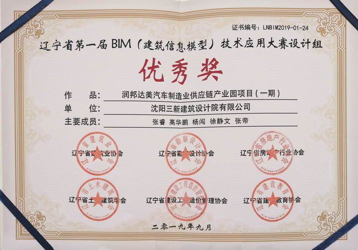 2019年10月18日,“遼寧省第一屆BIM(建筑信息模型)技術(shù)應(yīng)用大賽”召開(kāi)了頒獎(jiǎng)大會(huì),頒發(fā)獎(jiǎng)牌及榮譽(yù)證書。我公司由張睿、高華鵬、楊闖、徐敬文、張帝組成的BIM團(tuán)隊(duì)提交的參賽項(xiàng)目《潤(rùn)邦達(dá)美汽車制造業(yè)供應(yīng)鏈產(chǎn)業(yè)園項(xiàng)目(一期)》斬獲遼大賽優(yōu)秀獎(jiǎng)。