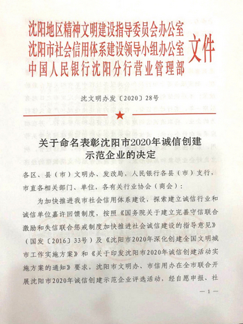 9月10日下午,沈陽(yáng)市文明辦、市信用辦聯(lián)合召開(kāi)“沈陽(yáng)市2020年誠(chéng)信創(chuàng)建示范企業(yè)”表彰大會(huì)。我公司榮獲“沈陽(yáng)市2020年誠(chéng)信創(chuàng)建示范企業(yè)”稱(chēng)號(hào)。