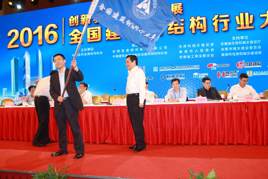 最后,安徽富煌鋼構(gòu)股份有限公司董事長楊俊斌將象征著年會承辦權(quán)的會旗交到2017年的承辦單位沈陽三新實業(yè)有限公司總經(jīng)理洪長禧手中,我們明年沈陽再聚首!